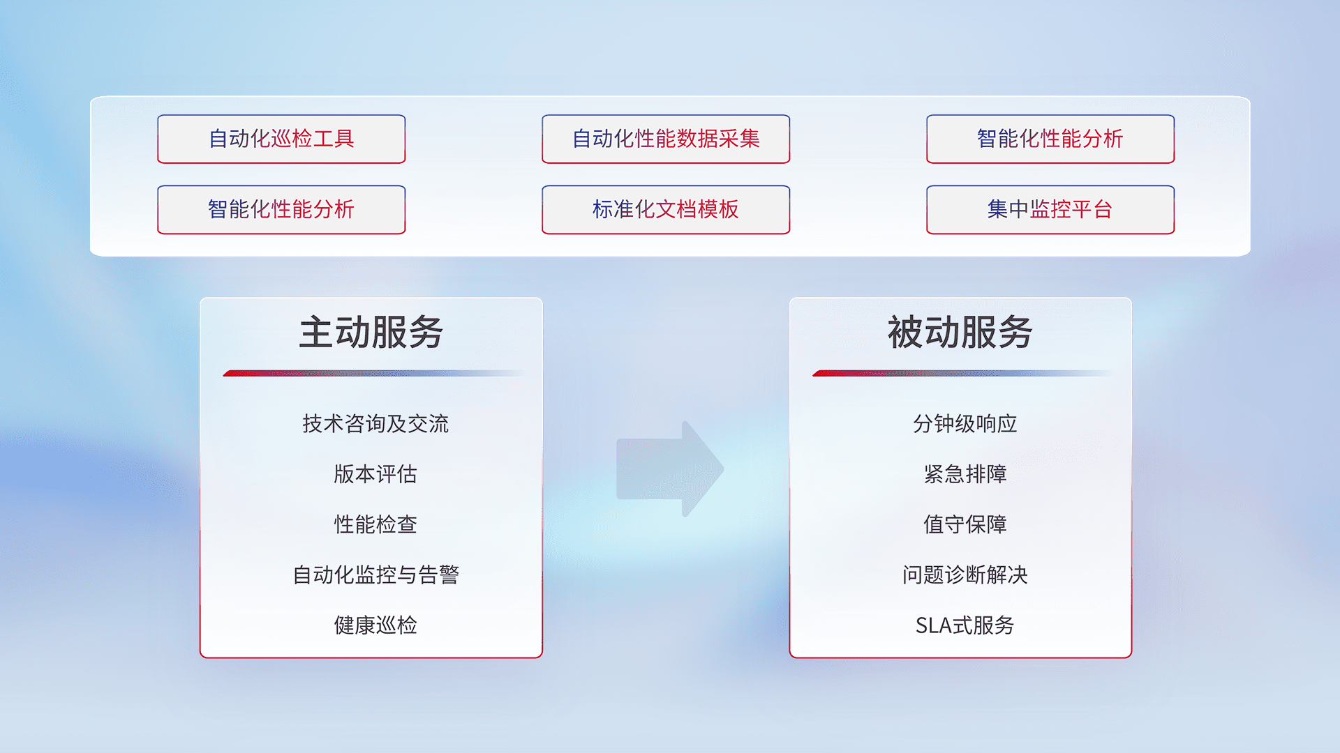 智能化工具和标准化文档,,,,保障服务质量,,,,提供主动服务(包含技术咨询、、、、版本评估、、、性能检查、、、、自动化监控与告警、、健康巡检)和被动服务包含(分钟级响应、、、、紧急排障、、、值守保障、、、、问题诊断解决、、、SLA服务)。。。